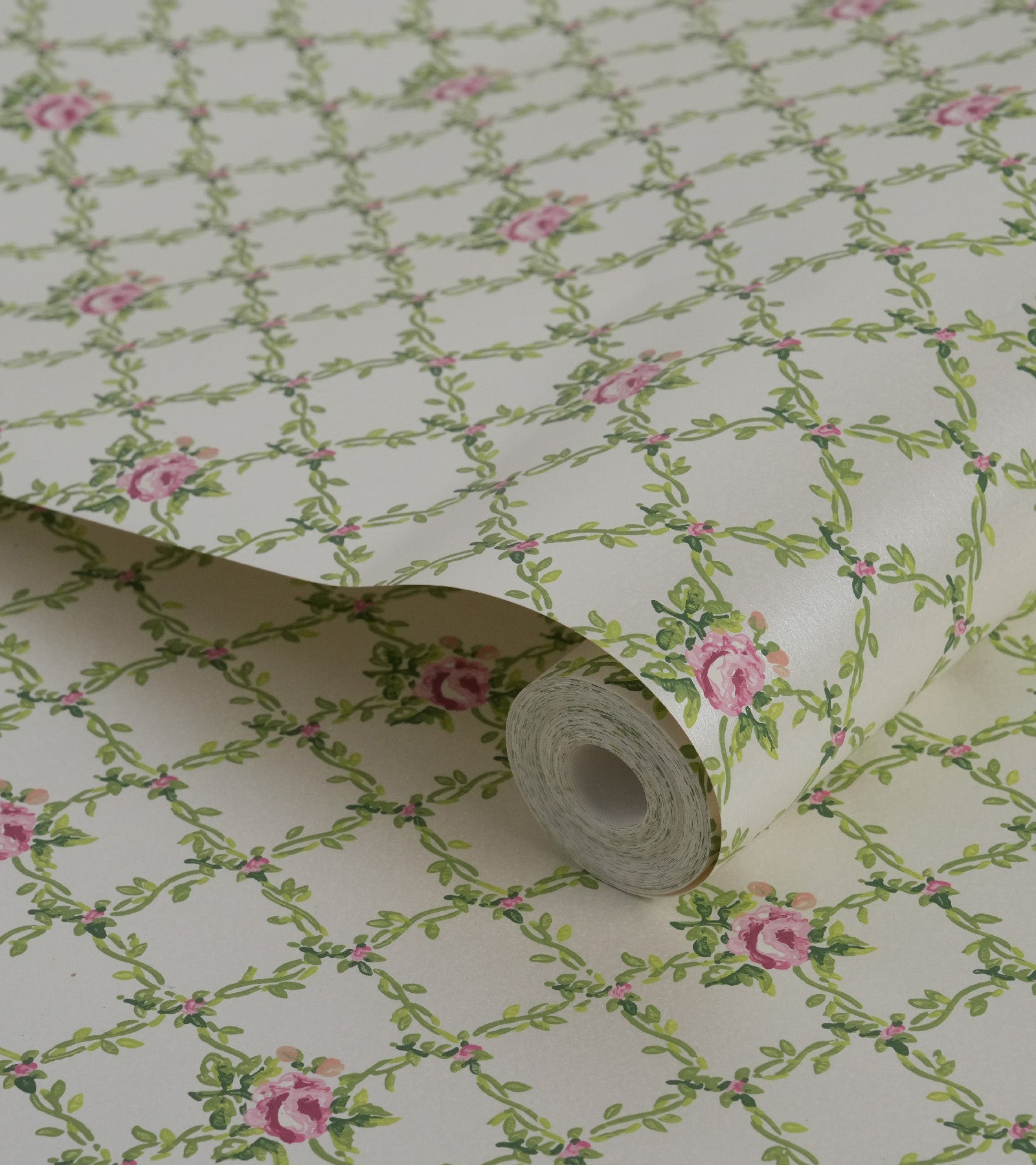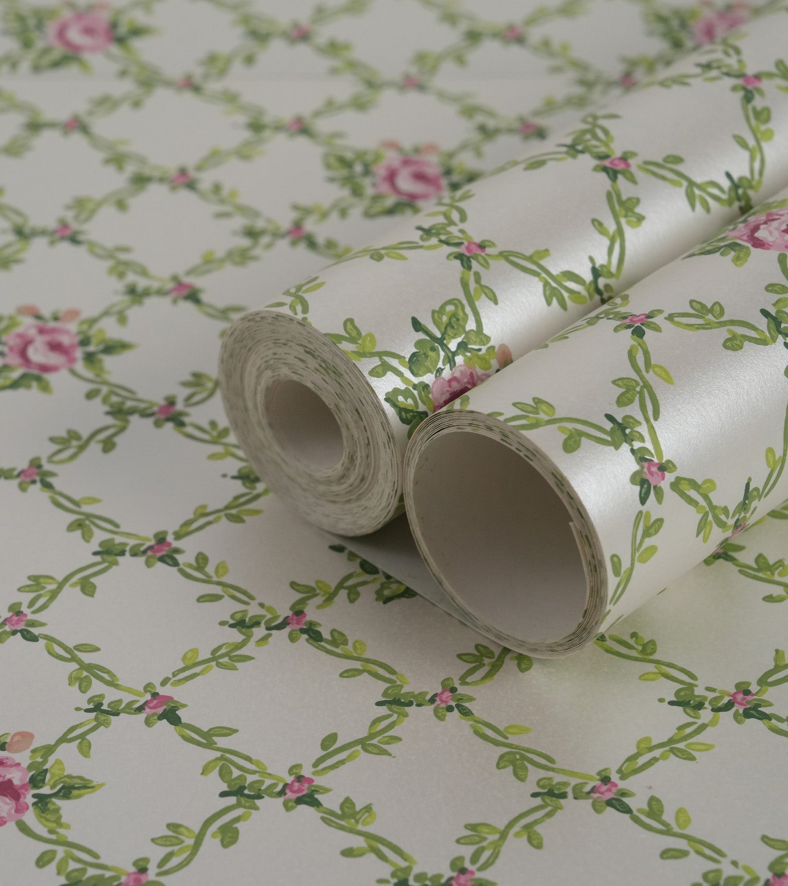Add a touch of tradition and elegance to your interior space with this green leafy crisscross design wallpaper, featuring beautiful pink flowers. The exquisite design, reminiscent of Mughal paintings, imparts a classic and sophisticated appearance to any room. Ideal for use in balconies, hallways, or drawing rooms, this wallpaper pairs beautifully with traditional-looking furniture, elevating the overall aesthetic of your decor to a new level of charm and beauty.