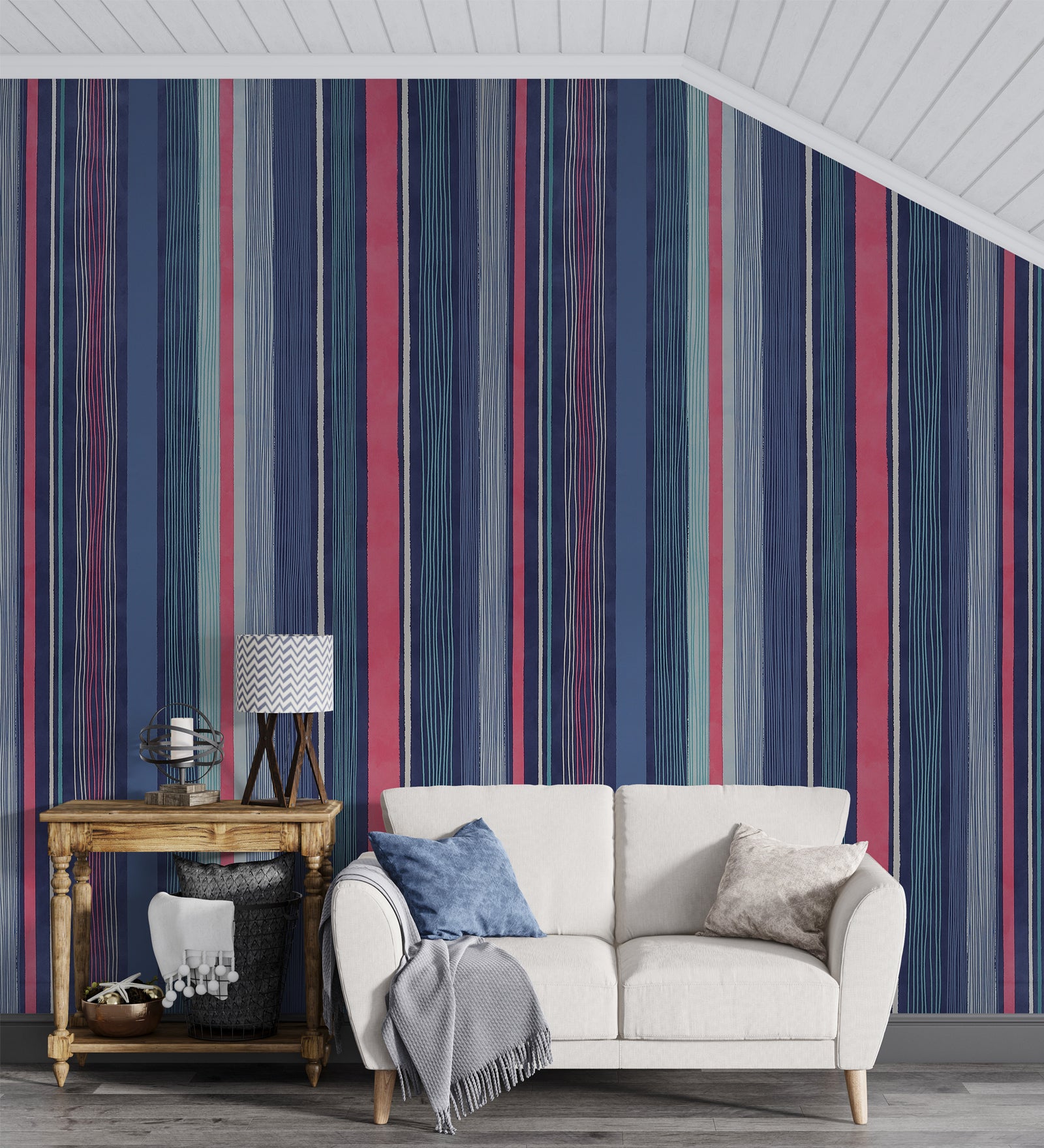 This mesmerizing wallpaper boasts a stylish stripe design in blue,
