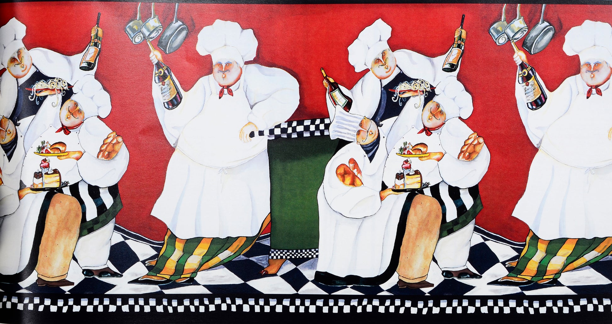 This wallpaper with a vectored line of motifs depicting an artful rendition of your classic italian master chefs is as colorful as it is creative an illustration of the beloved characters. The reds, greens and blacks combine to create a vibrant picture that ties together a kitchen or serves as a highlight combined with any another wallpaper