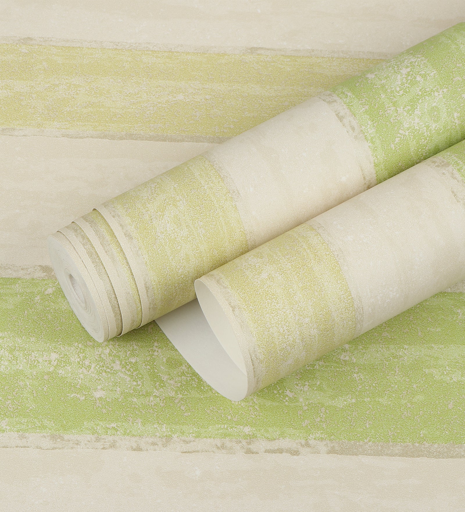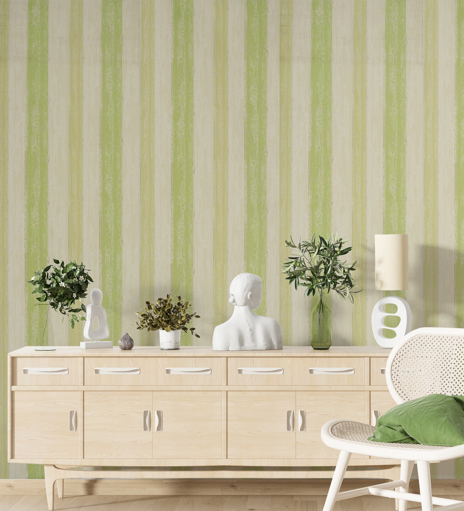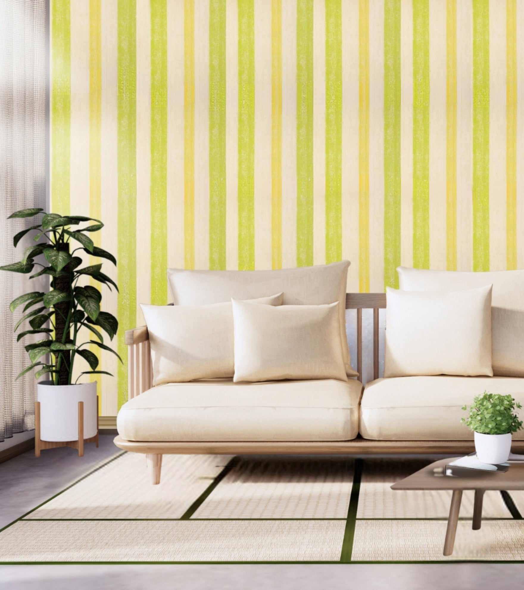 The wallpaper features a delicate striped design in light shades of yellow and beige, imparting an earthy and organic feel to the space. The use of light colors also enhances the brightness of the room, making it feel more open and inviting. This wallpaper looks particularly striking when paired with dark-colored upholstery and furniture in a bedroom, living room, or dining area, creating a beautiful contrast that adds depth and dimension to the space.