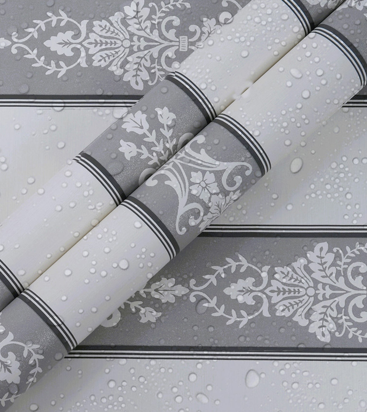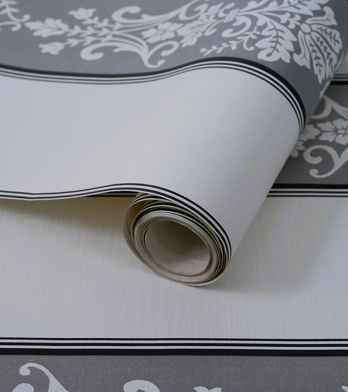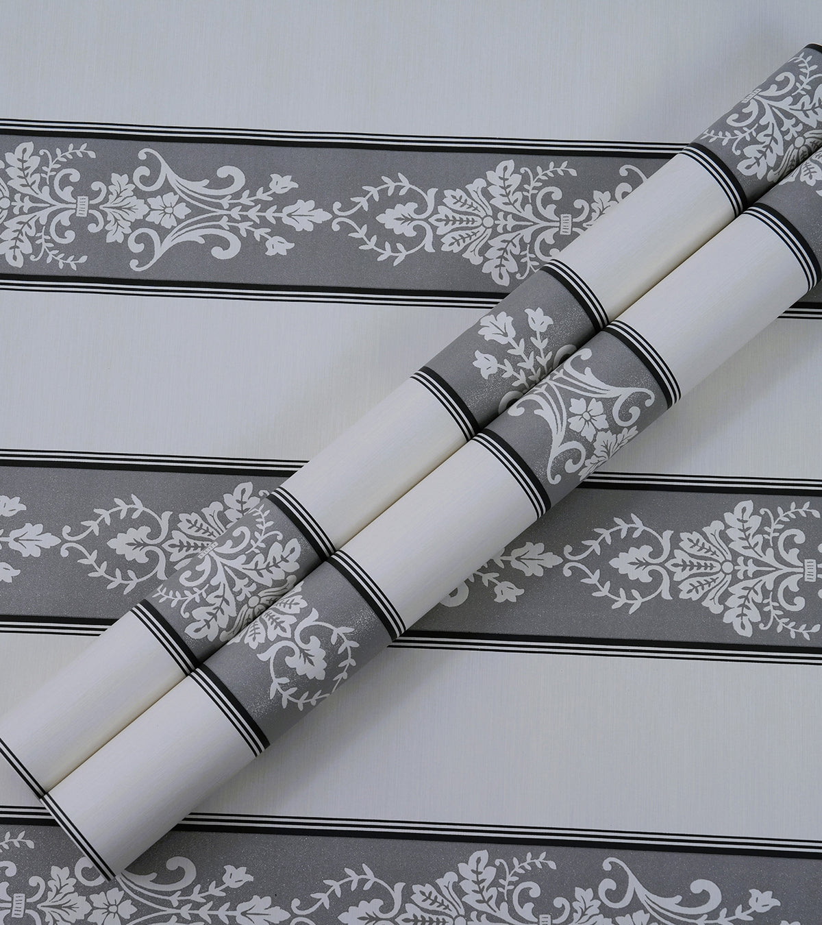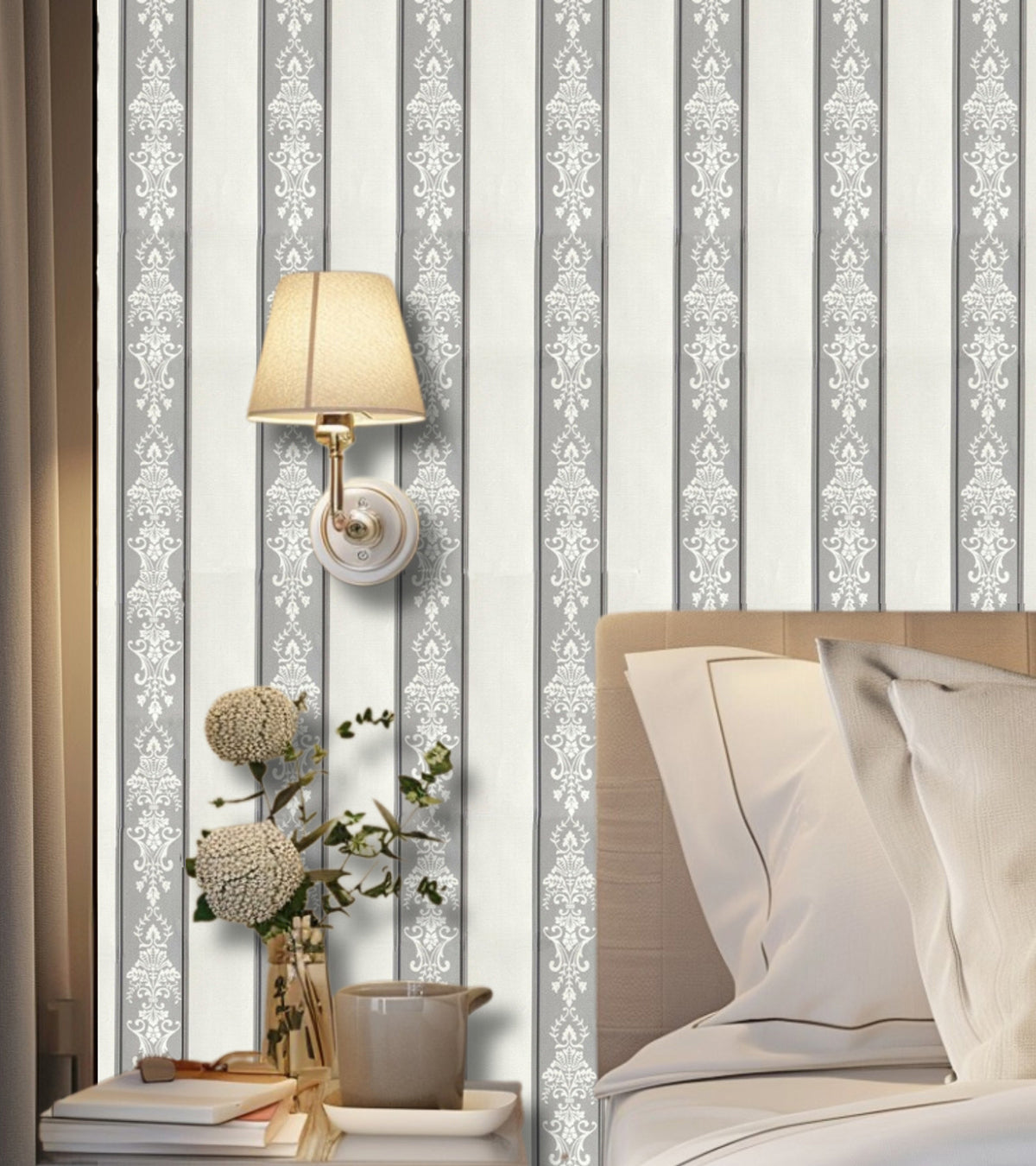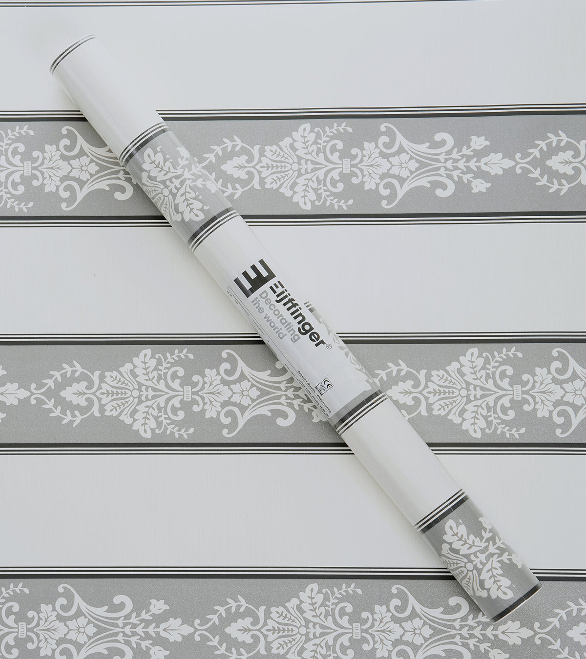 Bring designer style to your walls with this Grey and off white Striped Alternate Baroque Design Wallpaper. Its intricate baroque design, combined with alternating faded stripes, adds a unique visual